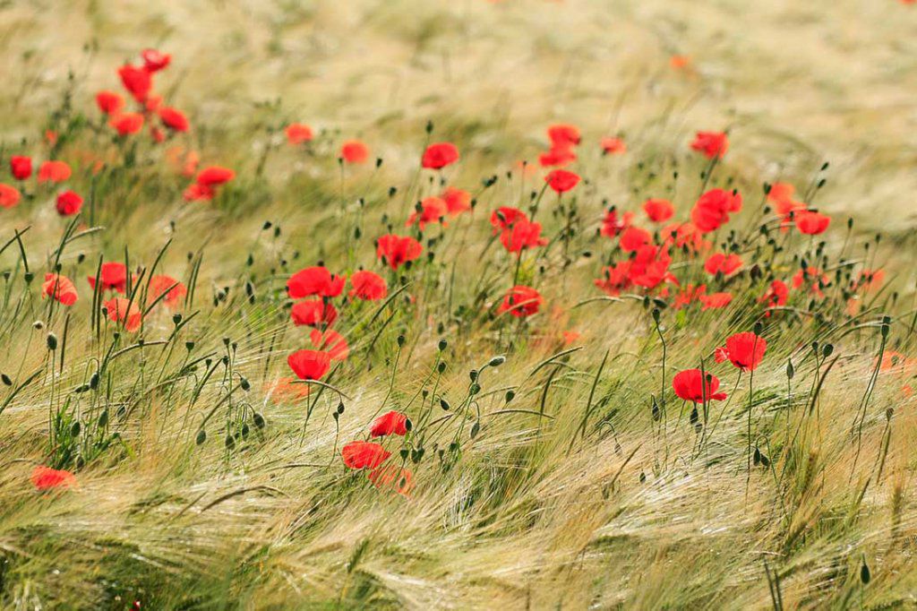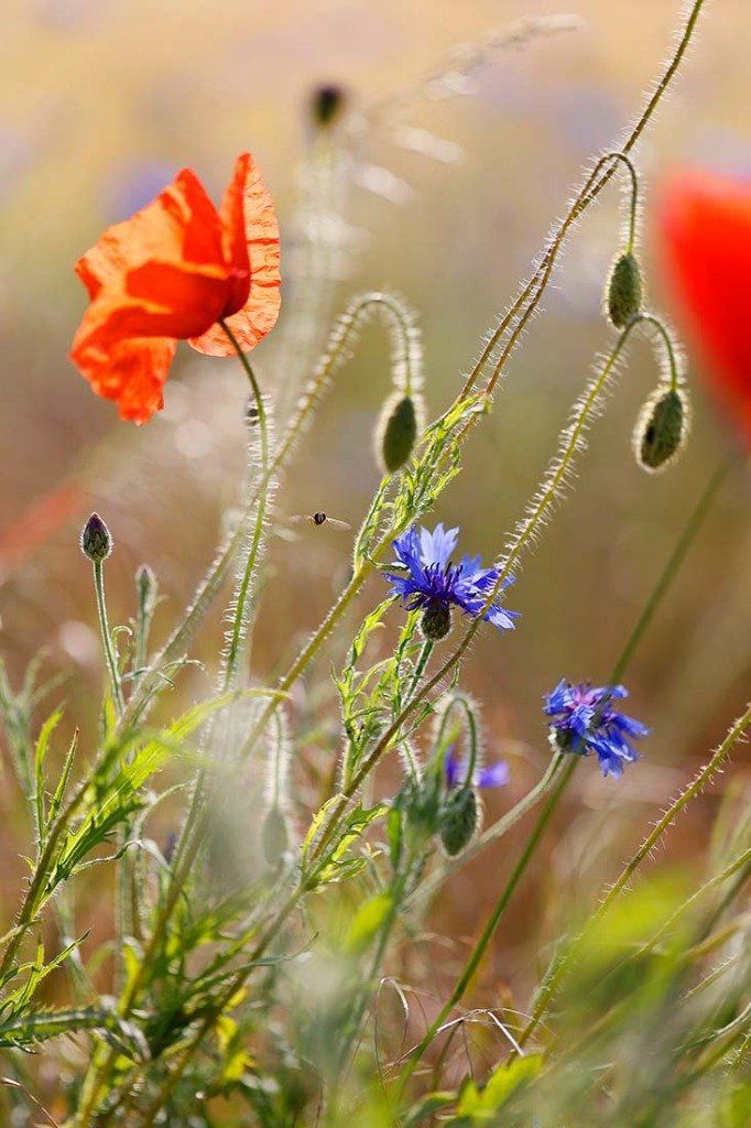 Coquelicots, bleuets et syrphe en vol