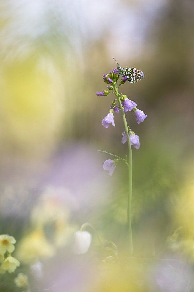 Aurore mâle sur cardamine des prés et primevères ou coucous